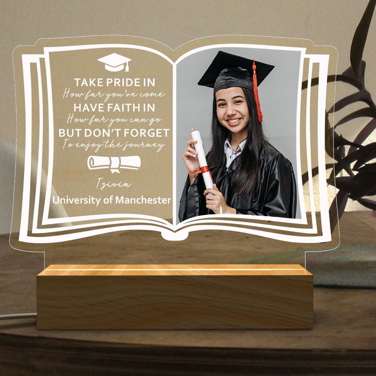 Celebrate success with a personalized book shape graduation LED gift. A glowing keepsake for graduates, perfect for names, dates, and achievements.